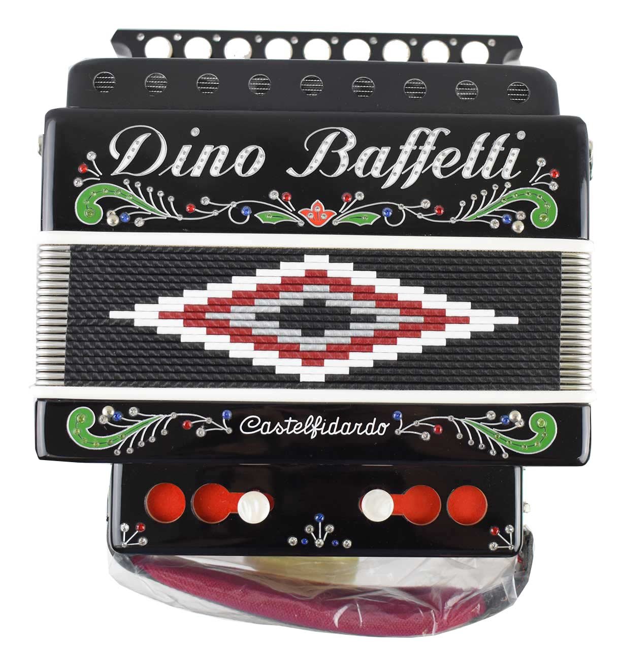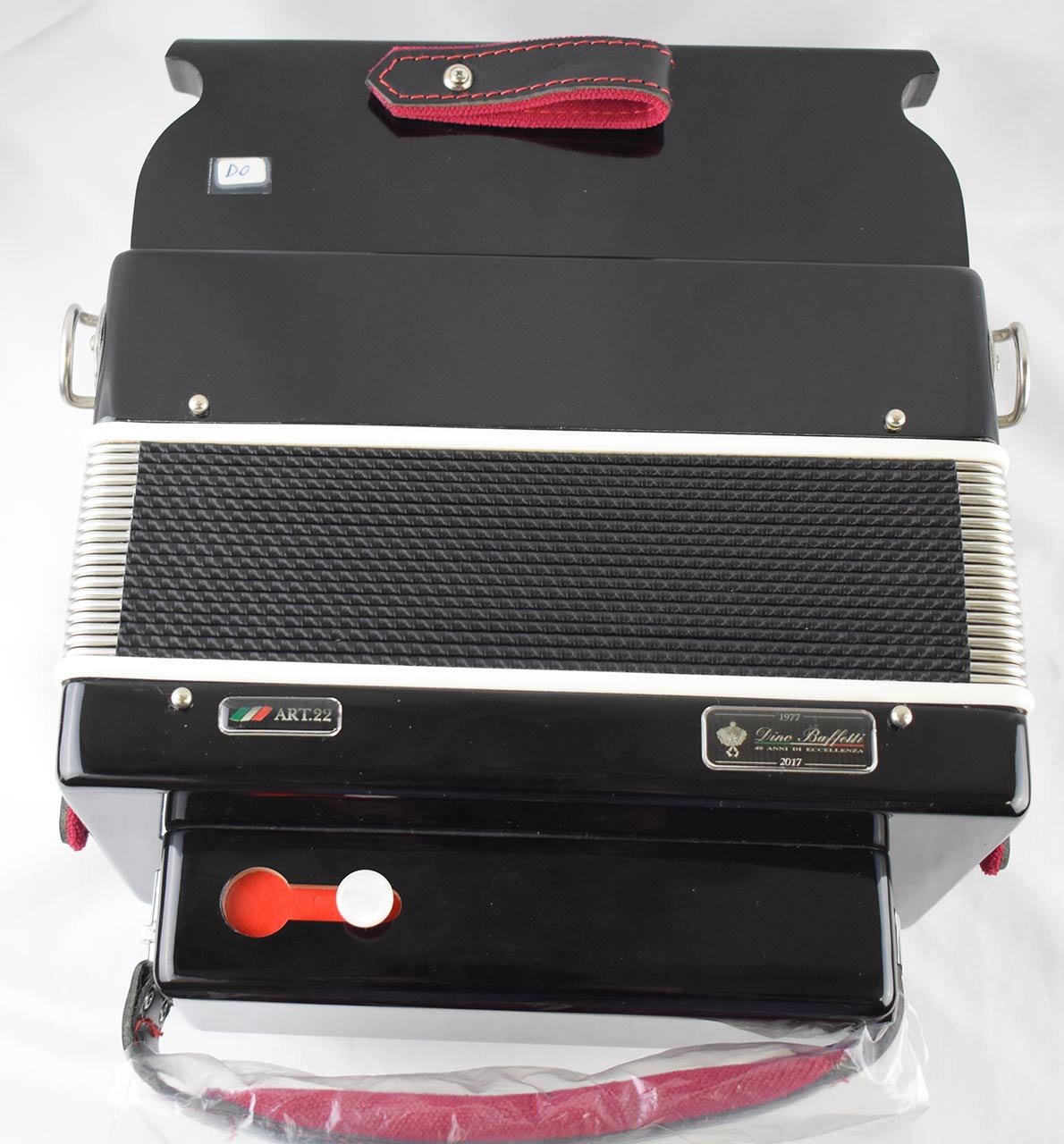 organetto molto bello e curato. ricoperto in celluloide nera. 12 tasti al canto, 2 ai bassi.3 voci al canto e 4 ai bassi. 1 registro al canto.